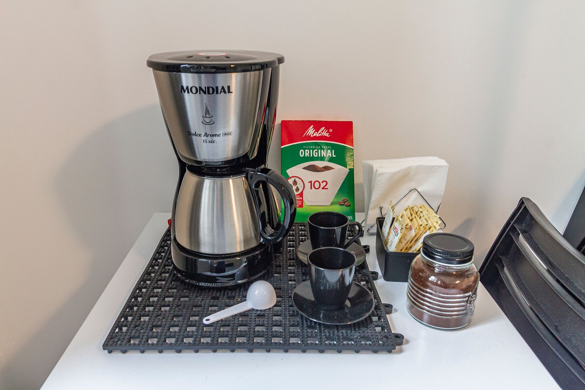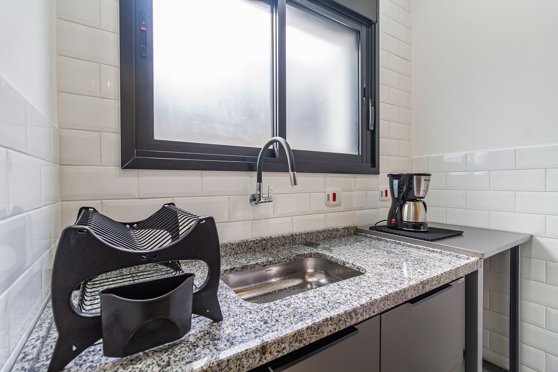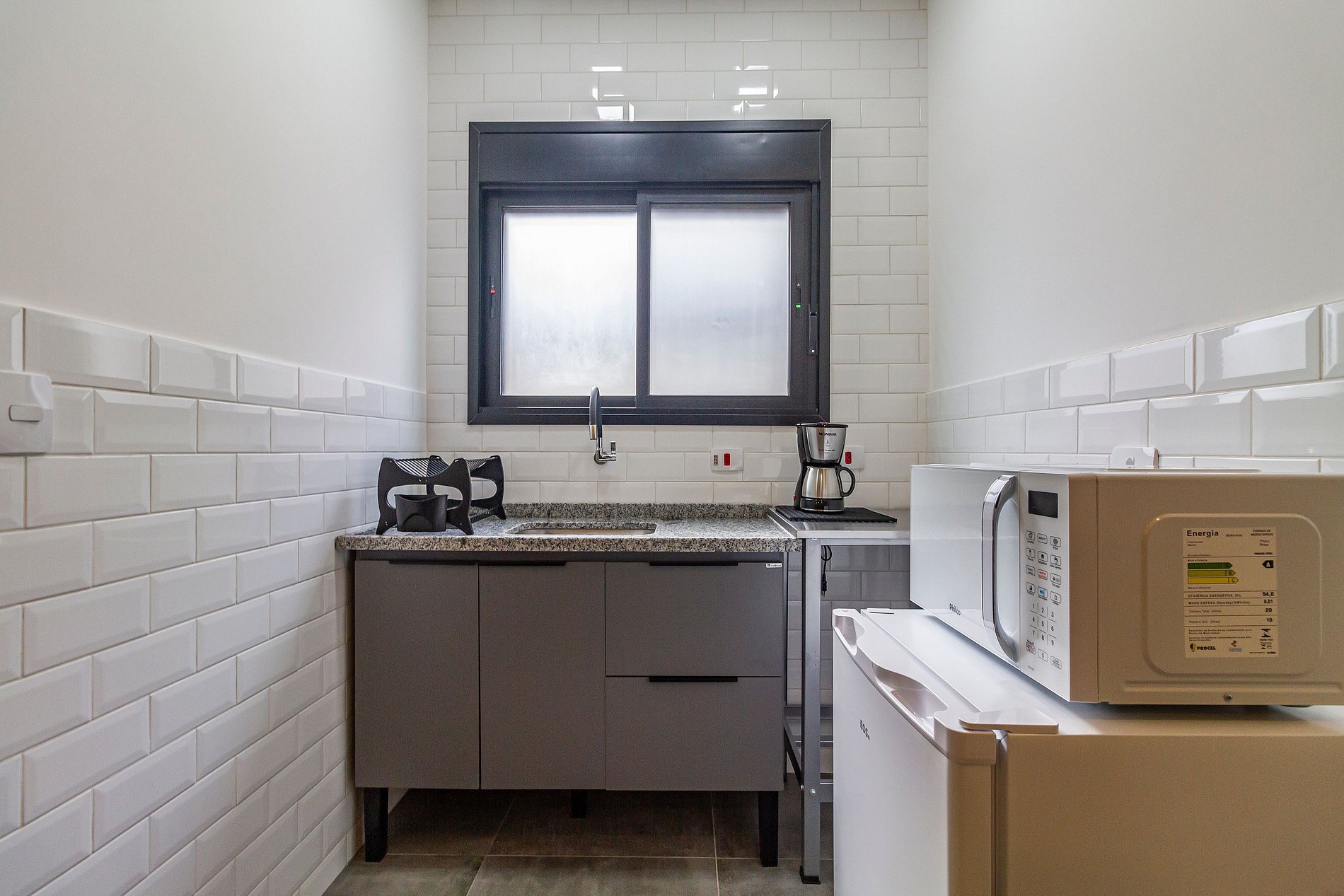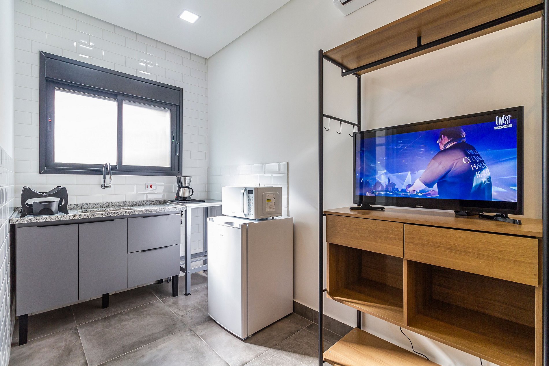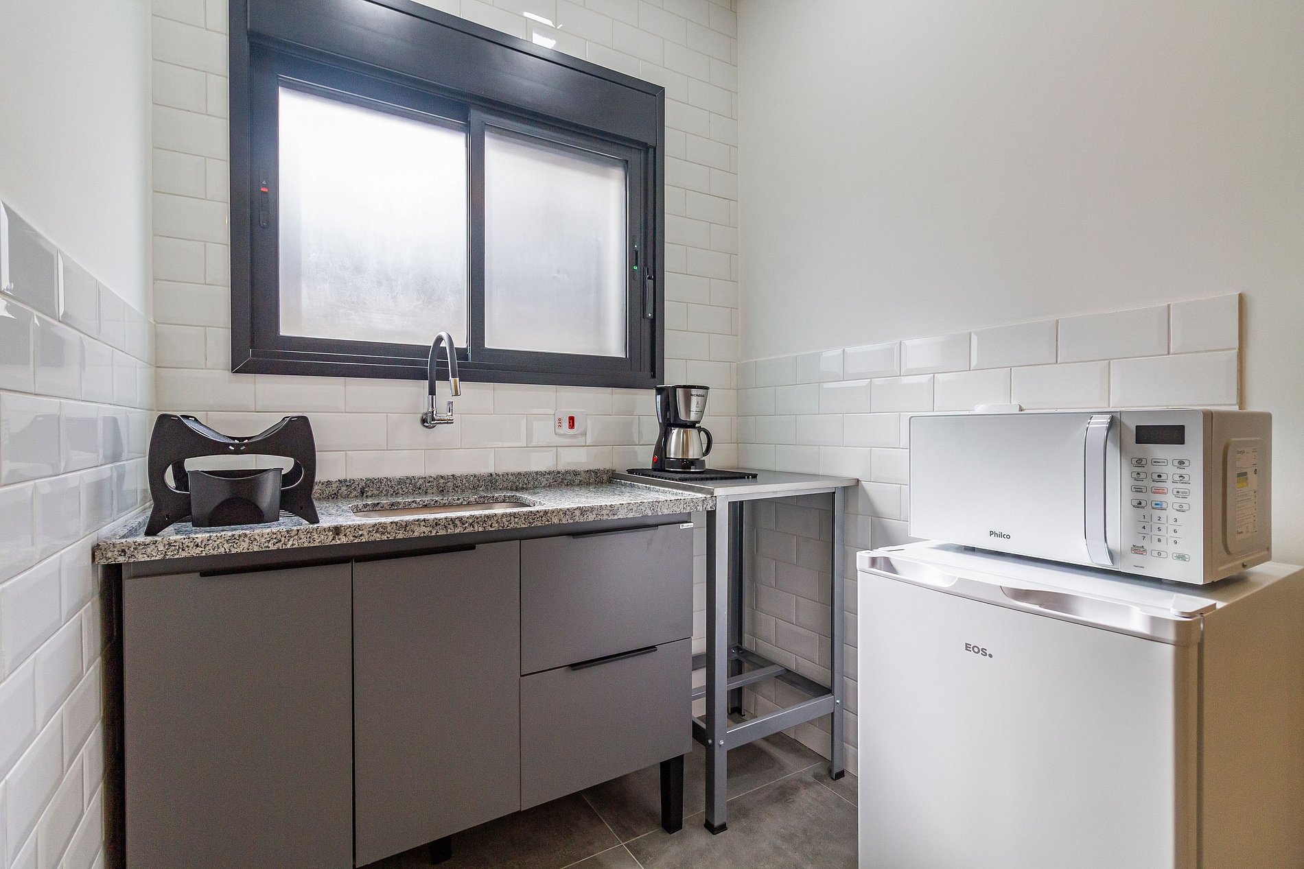 - Cozinha equipada com cooktop 1 boca, frigobar, micro-ondas, cafeteira elétrica e utensílios.